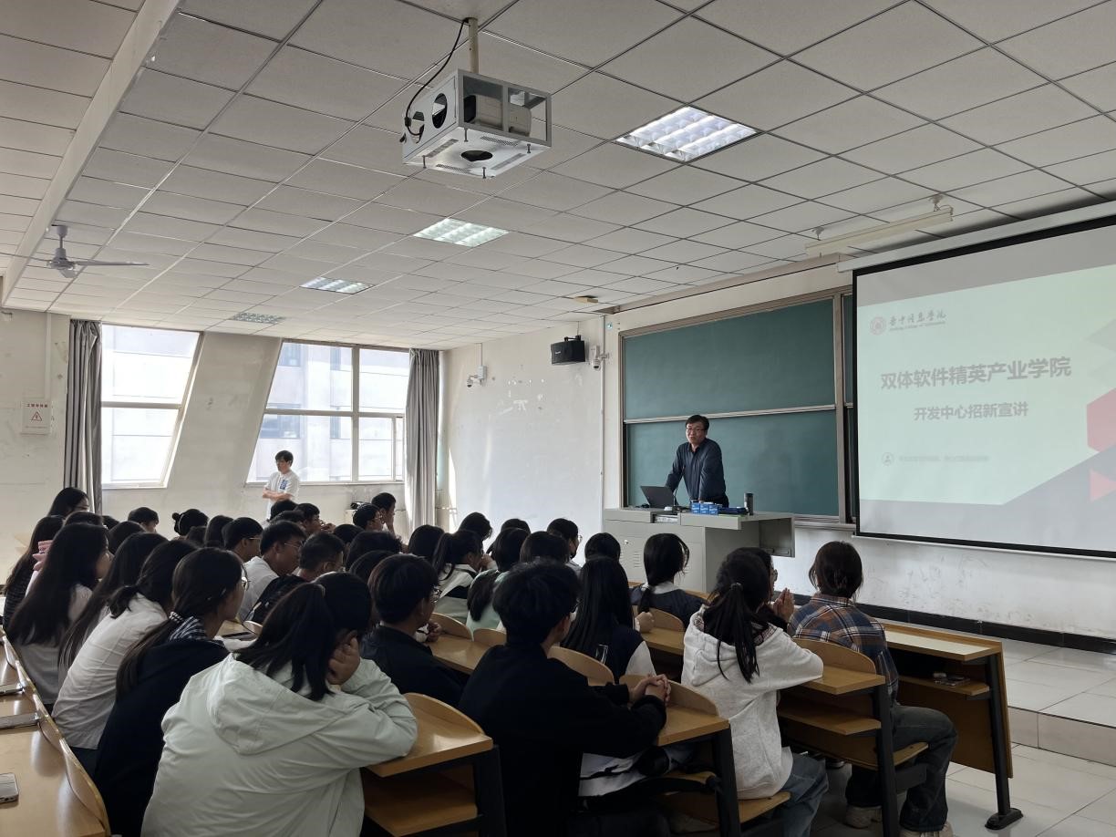 活动最后,双体软件精英产业学院负责老师登台解读“双体系”人才培养路径:大三或大四进入双体系学习,强调“双体系终极目标就是高质量就业”,鼓励同学在大三前完成知识储备,大三大四积极投身选拔,用项目经验为就业加码。老师还分享了一些优秀学长学姐通过双体系成功入职名企的案例,让同学们对未来充满期待。
