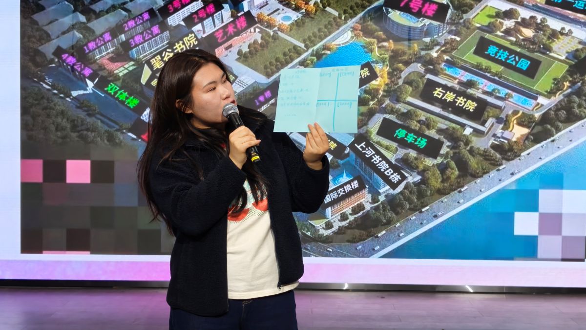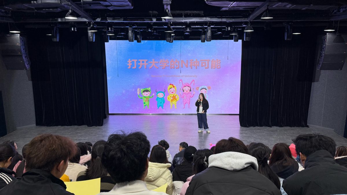 王老师还为大家“解锁”了校园里的各类资源“彩蛋”。艺术实践中心配备舞蹈排练室,见山剧场、乌马河剧院随时欢迎你登台展示;橄榄球场、健身房、游泳馆等设施,全力助力打造“最体育的非体育大学”;“信院CBD”及周边区域是开展社团活动与志愿服务的绝佳场所。此外,学校还有划桨板、真人CS等特色项目等你来挑战。王老师鼓励大家:“要‘薅’足资源,大胆参与,才能叠满你的完满Buff!”